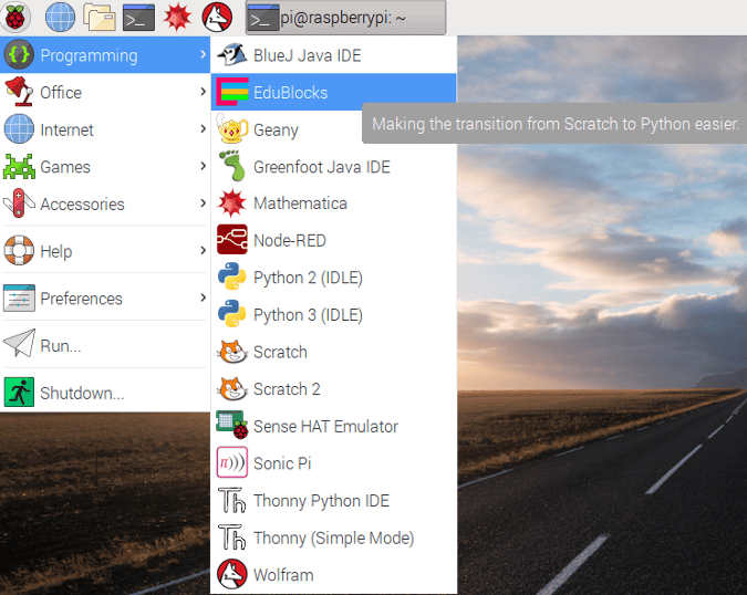 安装完成后,从桌面快捷方式或 Raspberry Pi 上的“编程”菜单启动 EduBlocks。
