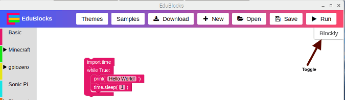 你可以通过单击最右侧的 Blockly 按钮来查看代码。它让你在 ”Blockly” 界面和普通的 Python 代码视图之间切换(正如你在任何其他 Python 编辑器中看到的那样)。